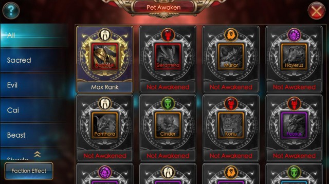 Pet Awaken is available for Rare/Epic Pets at 3 Stars, Legendary Pets at 2 Stars, Artifact Pets and just pets fragments can Awaken Pet.  Pets now have factions that they belong to: Holy, Evil, Dragon, Beast and Shadow. When Pets of each faction is awakened, they will gain different bonuses for different modes of the game.